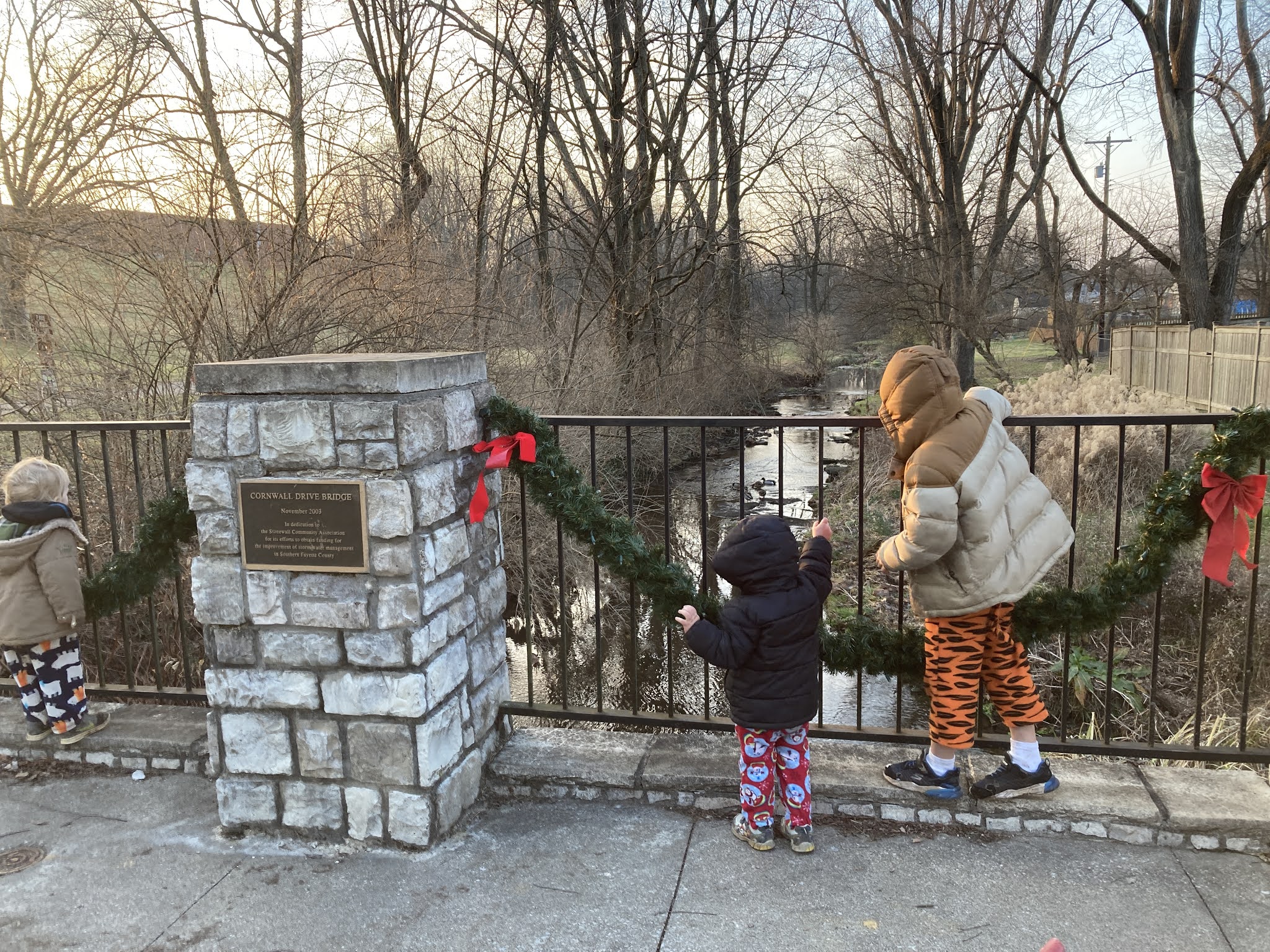 After we mastered walking to Wellington, we set our sights on the next park down the road -- Stonewall. We LOVE going here! There's a straight paved path that leads past an adult swing and a picnic table and ends at the woods. From there, you can meander through some forest trails. The boys love shimmying up a tall dirt hill. After a good rain, there's a peaceful trickling waterfall near the entrance to the forest. We've seen other kids try to catch crawdads in the creek. We also returned in January and were able to play on Stonewall's playgrounds (there are actually three).